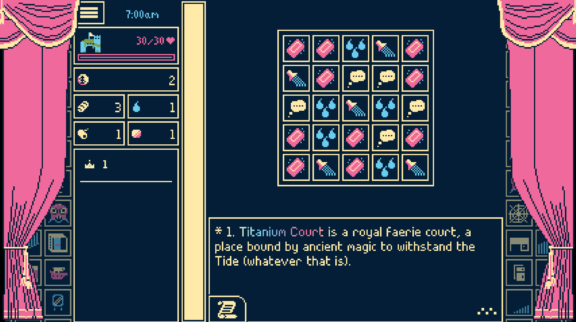 Anyway, it’s probably one of the sillier 90s surreal pixel graphics fae court inspired games and narratives. Titanium Court knows it, too, and is often self-referential or fourth wall breaking. The tutorial helpfully interjects to you in humorous ways like a nonsensical and ambiguous Clippy.